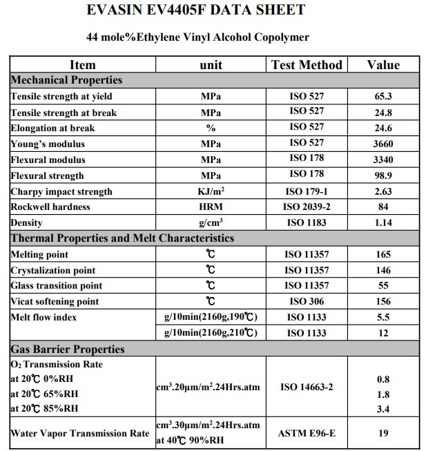 A resina EVASIN EVOH é uma copolímero de etileno-álcool vinílico, utilizada na fabricação de filmes, folhas e embalagens com alta barreira ao oxigênio. A série EVASIN oferece diversos graus de composição e propriedades reológicas adequadas para várias técnicas de processamento, como coextrusão multicamadas, fundição, moldagem por sopro, moldagem de folhas, estiramento biaxial, moldagem por injeção e moldagem por extrusão. O teor de etileno da resina EVASIN EVOH está relacionado às suas propriedades de barreira; menor teor de etileno resulta em maior barreira ao oxigênio, e maior barreira ao oxigênio leva a maior dureza da resina. EVASIN EVOH (EVOH EW-3201Possui excelentes propriedades de barreira a gases, bloqueando diversos odores de temperos, especiarias, cosméticos, etc., tornando-o adequado para embalagens de alimentos. Também apresenta excelente resistência a óleos e propriedades de barreira contra óleos e solventes químicos, encontrando aplicações em tanques de combustível automotivos, frascos de pesticidas e tubulações de aquecimento de piso.