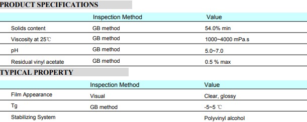 • Excellent Compatibility with Cement Systems: The PVA protective colloid improves the dispersibility of the emulsion when mixed with cement and fillers; significantly improves the sag resistance and thixotropic properties of cement paste.